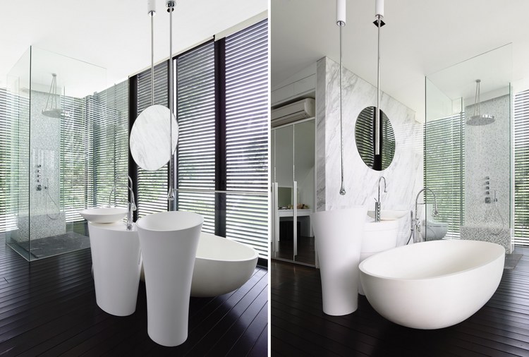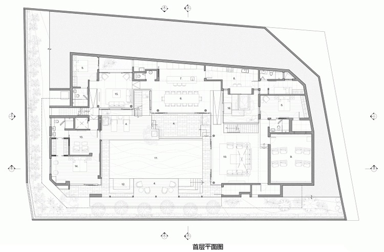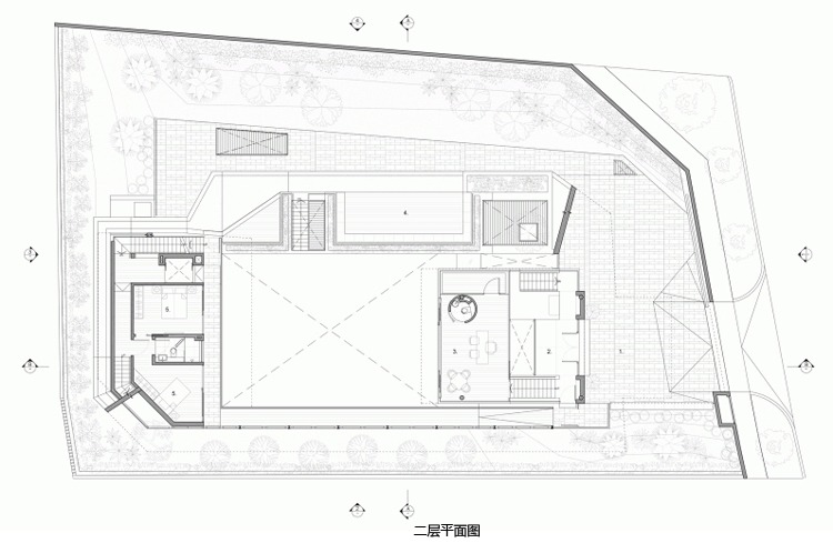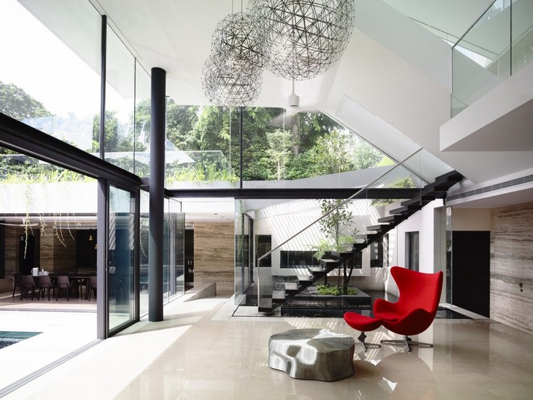 別墅設計安德魯路私人別墅(Andrew Road)設計師將與街面水平的這一層打造為封閉式的樣式,從入口處可以看到中央院落巨大的游泳池,四面各功能房采用了透明玻璃設計,高于街面水平層的二三層樓的屋頂略大于房屋,如鍋蓋一樣將房屋罩在下面。長條式的格柵落地玻璃窗設計與其他部分的設計相呼應,體現(xiàn)了整個別墅簡明的風格樣式。D字型的內(nèi)部空間設計將房間主要設置在半弧形的位置,過道和樓梯則位于D字形垂直的豎向位置,起到了隔離噪音等作用。