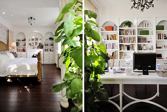 純白色的主臥設計帶有書房功能,主桌的款式也是專門定做的,雙人位的設計是方便兩人同時使用,書柜造型是借用了鄉村風格中的拱形門造型。床的一側也是一個裝飾柜,所不同的是中間造型做了一個壁爐,冬天取暖很實用的。